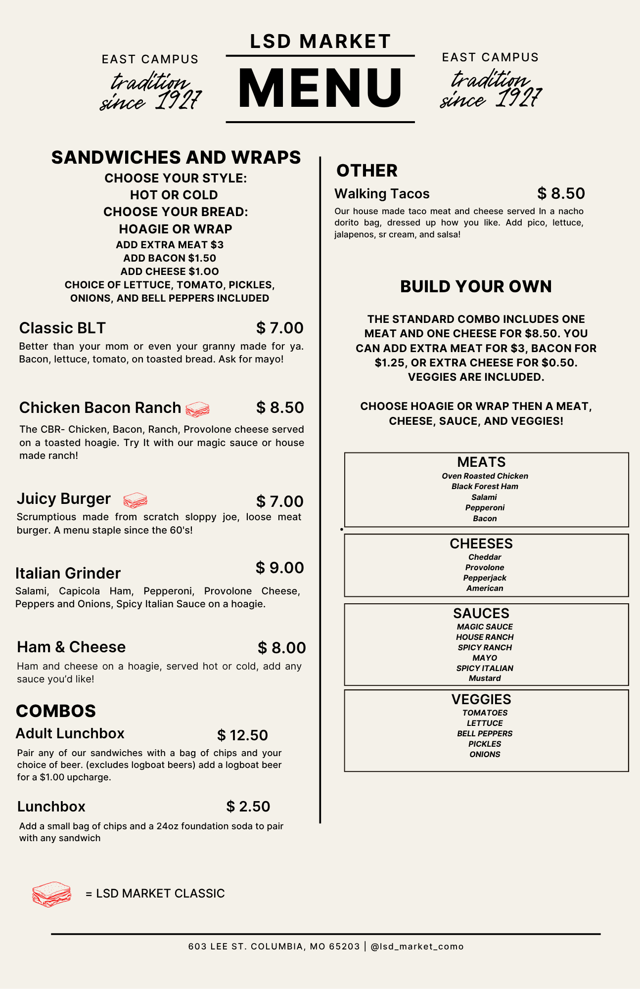 Find some familiar favorites and hopefully your new favorites on our expansive menu! We couldn’t get rid of classics like the Juicy Burger or the Chicken Bacon Ranch, but we are happy to bring you some fun new flavors with our Italian Grinder. Come in and see us!
